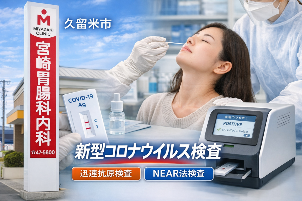 久留米市で新型コロナウイルスの検査・発熱外来をお探しの方へ。宮﨑胃腸科内科医院では、予約不要で受診できる発熱外来を設け、新型コロナウイルス感染症をはじめ、インフルエンザなどの急性呼吸器感染症に迅速かつ丁寧に対応しています。地域の「かかりつけ内科」として、お困りのときにすぐ相談できる環境づくりを大切にしています。